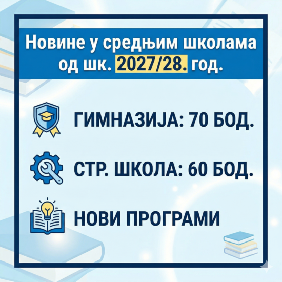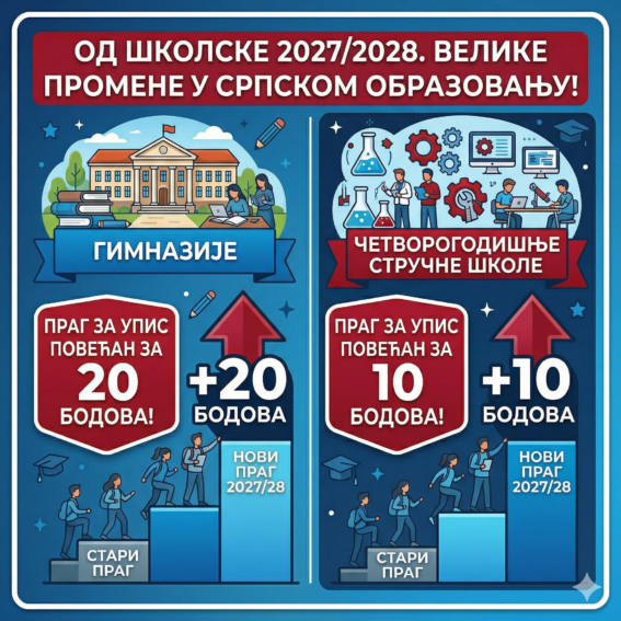 Од школске 2027/2028. минимални број бодова за упис у гимназије биће 70, а за стручне и уметничке школе 60, уместо досадашњих 50, што доноси строже услове и већу конкуренцију међу будућим средњошколцима…