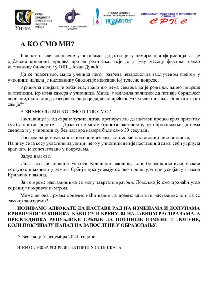 A КО СМО МИ? Саопштење репрезентативних синдиката