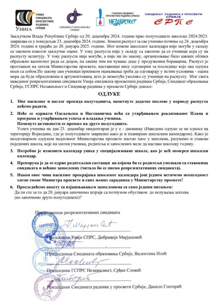 ОДЛУКА ЧЕТИРИ РЕПРЕЗЕНТАТИВНА СИНДИКАТА НА ПРЕВРЕМЕН КРАЈ ПРВОГ ПОЛУГОДИШТА ШКОЛСКЕ 2024/2025. ГОДИНЕ