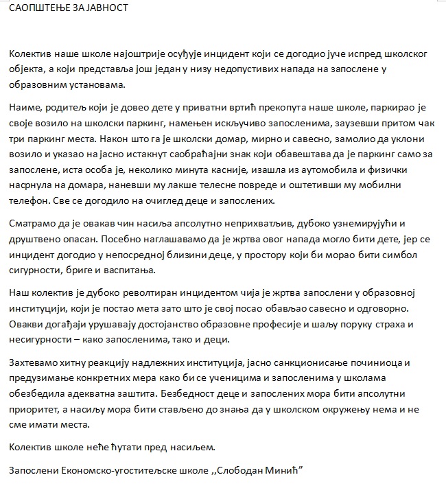 Наиме, родитељ који је довео дете у приватни вртић прекопута наше школе, паркирао је своје возило на школски паркинг, намењен искључиво запосленима, заузевши притом чак три паркинг места. Након што га је школски домар, мирно и савесно, замолио да уклони возило и указао на јасно истакнут саобраћајни знак који обавештава да је паркинг само за запослене, иста особа је, неколико минута касније, изашла из аутомобила и физички насрнула на домара, наневши му лакше телесне повреде и оштетивши му мобилни телефон. Све се догодило на очиглед деце и запослених.